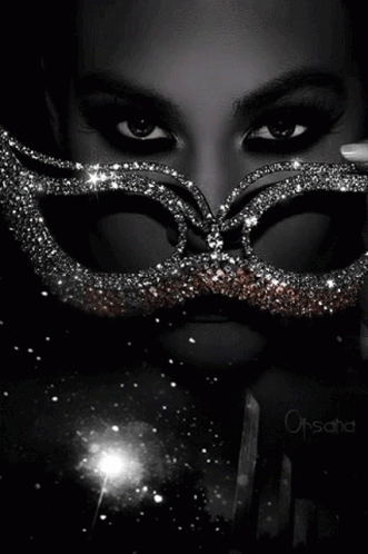 A person's eyes peer over a sparkling, glitter-covered masquerade mask in a dramatic black and white scene.