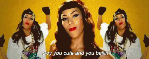 Beyoncé lip-syncing to 'Boy you cute and you ballin'' against a vibrant yellow background in a music video.