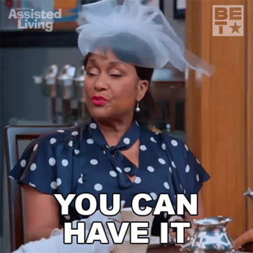 Marilyn Wynfield, dressed in a polka dot dress and hat, delivers the line 'You Can Have It' from Assisted Living.