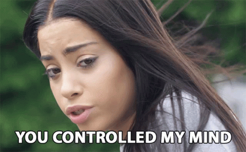 A young woman with dark hair speaks directly to the camera, expressing the phrase "You controlled my mind."