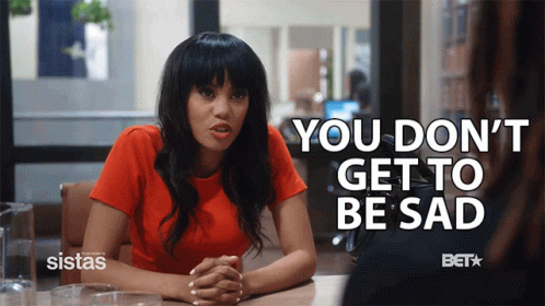 Jasmine Borders delivers the line 'You Don't Get To Be Sad' from Tyler Perry's Sistas, with the phrase on screen.