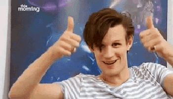 Doctor Who actor gives a cheerful double thumbs up, smiling broadly in a striped shirt.