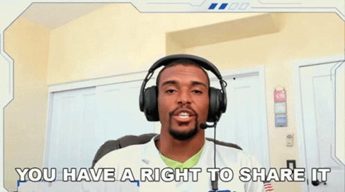 Brock Vereen speaks into a headset microphone, delivering the powerful message 'You Have A Right To Share It'.