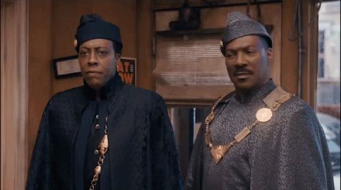 Akeem (Eddie Murphy) and Semmi (Arsenio Hall) share a skeptical look in a scene from Coming to America 2.