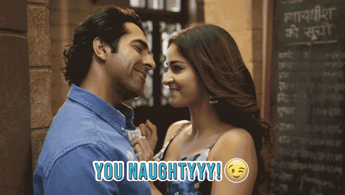 Ayushmann Khurrana and Ananya Panday share a playful moment, with the caption 'You Naughtyyy!' appearing on screen.