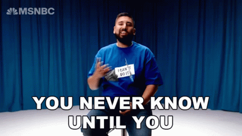 A man in a blue 'I Can't Do It' shirt shares a motivational message: 'You never know until you play the game, right?'