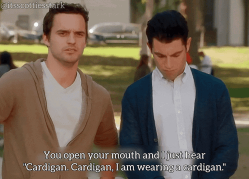 Nick Miller from New Girl reacts to a comment about his attire, emphatically stating, "Cardigan. Cardigan, I am wearing a cardigan."