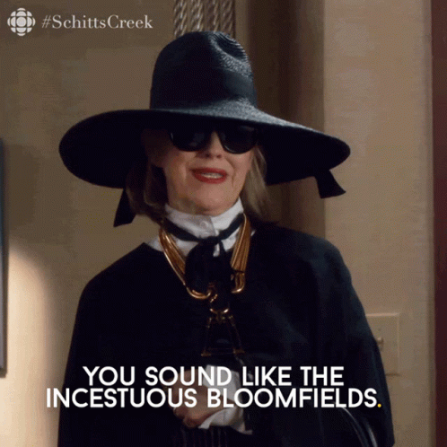 Moira Rose delivers a classic line from Schitt's Creek, wearing her iconic hat and sunglasses.