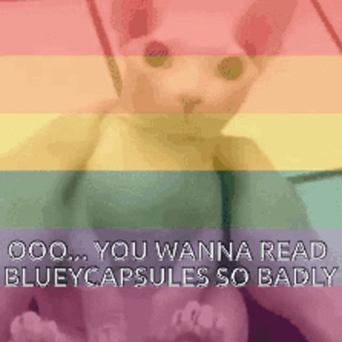 A funny cat meme with a rainbow overlay, featuring the text 'OOO... YOU WANNA READ BLUEYCAPSULES SO BADLY'.