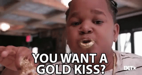 Pio La Ditingancia with gold lipstick asks 'You want a gold kiss?' while holding a golden chicken wing.