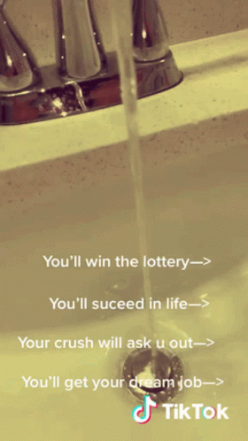 A hand catches water flowing from a faucet in a sink, with text overlays promising winning the lottery, succeeding in life, a crush asking you out, and getting a dream job.