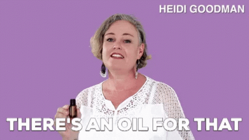 Heidi Goodman holds an essential oil bottle, stating her catchphrase 'There's an oil for that.'