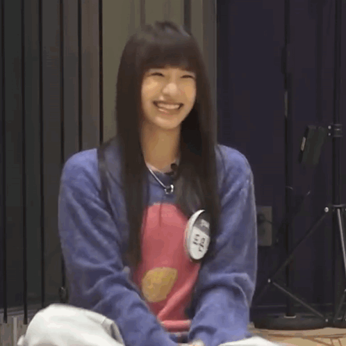 a woman in a blue sweater and a pink shirt is smiling while holding a piece of paper .
