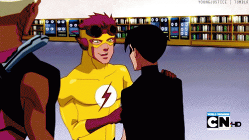 Kid Flash and Robin from Young Justice share a moment, talking and smiling, with Aqualad nearby.