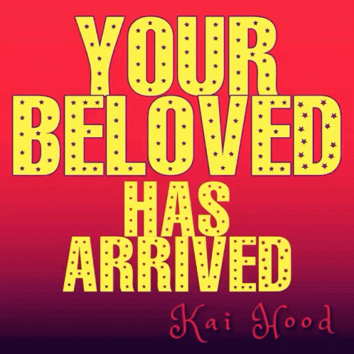 A vibrant poster featuring the text 'Your Beloved Has Arrived' by artist Kai Hood, set against a red background.