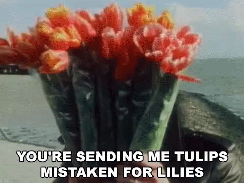 Elvis Costello holding tulips, singing 'You're Sending Me Tulips Mistaken For Lilies' from New Amsterdam.