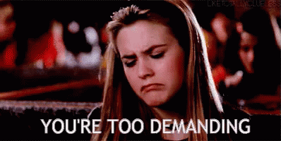 Cher Horowitz (Alicia Silverstone) from Clueless expresses frustration, saying 'You're too demanding'.