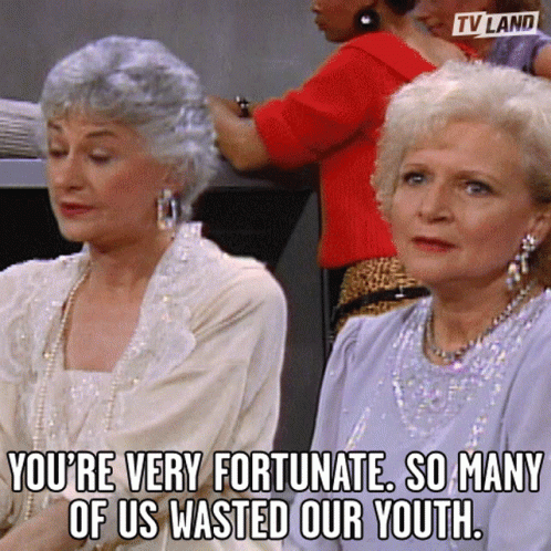 Beatrice Arthur as Dorothy Zbornak and Betty White as Rose Nylund discuss wasted youth in Golden Girls.