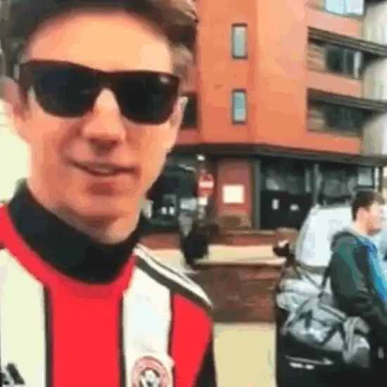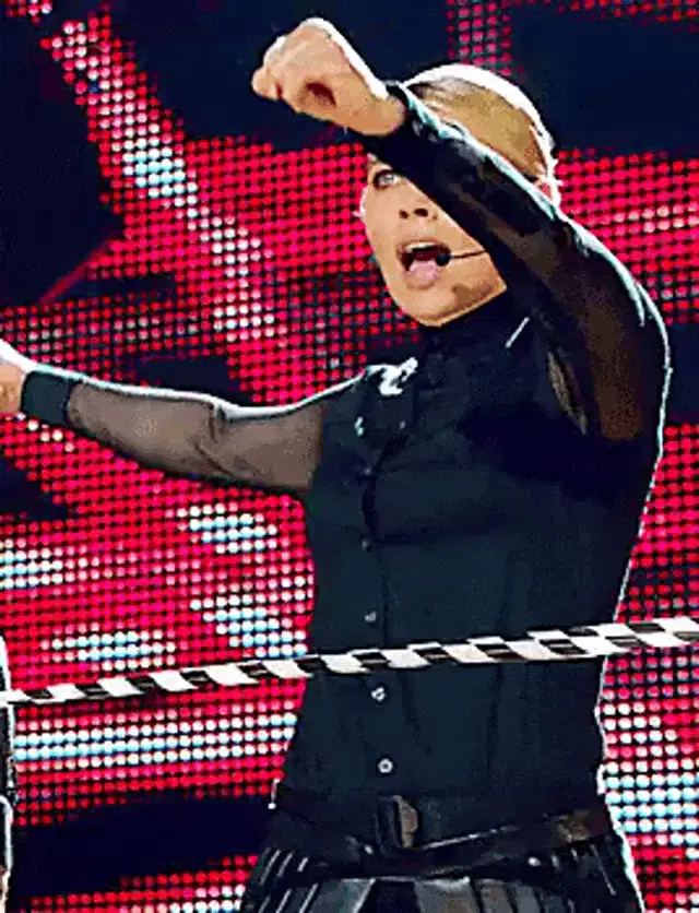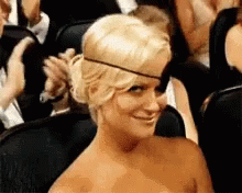 Blonde woman with an eyepatch smiles and gestures 'You're Welcome' in a crowd.