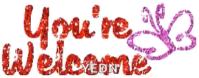Animated words 'You're Welcome' appear in red and purple glitter, accompanied by a sparkling butterfly.