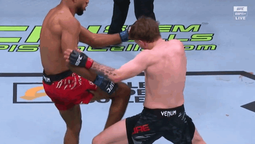 a man in a venum shorts kicks another man in red shorts