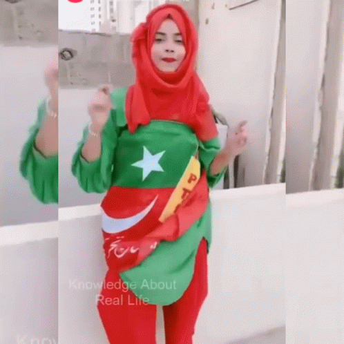 Youthni dancing enthusiastically in full PTI political party attire, featuring a red hijab and green flag shirt.