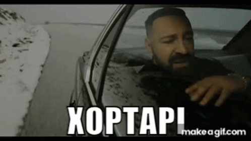 A man with a beard is driving a car on a snowy road, with the text 'HORTARI!' displayed.