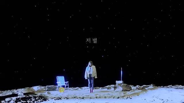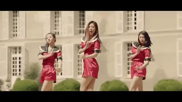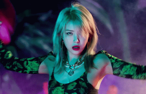 Yubin, with green hair, wearing a green dress and gloves, performs in her 'Perfume' music video.