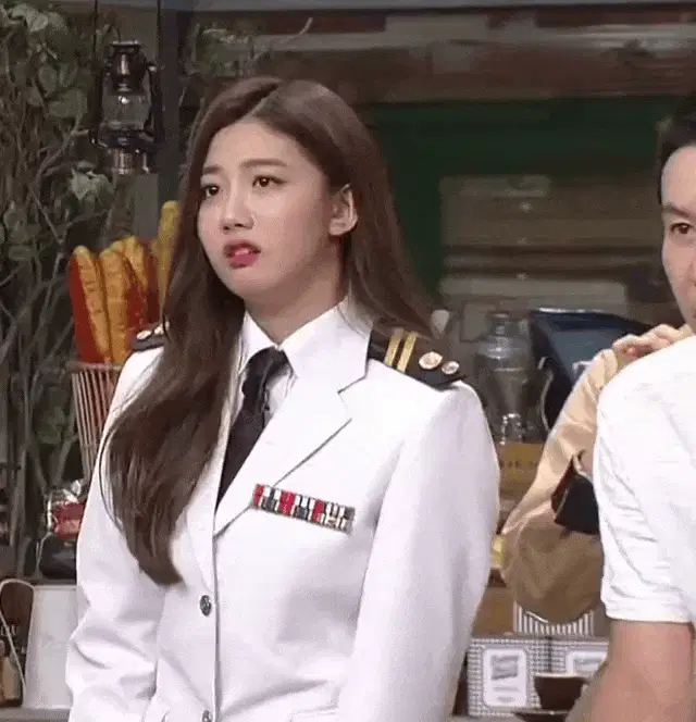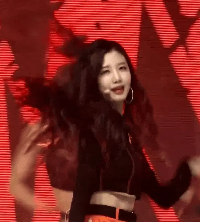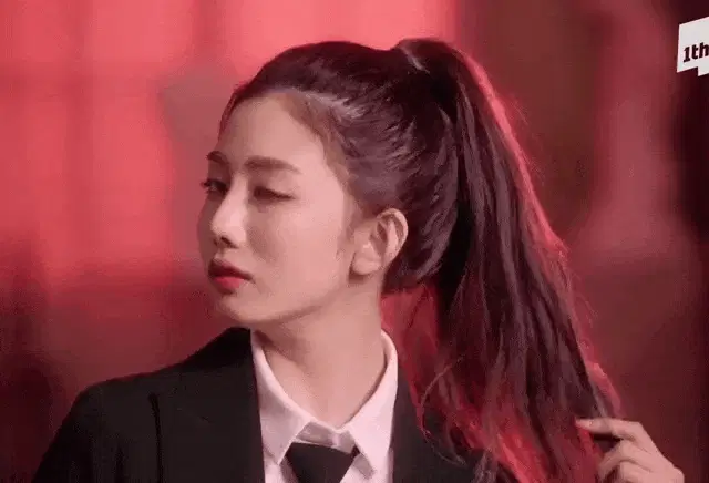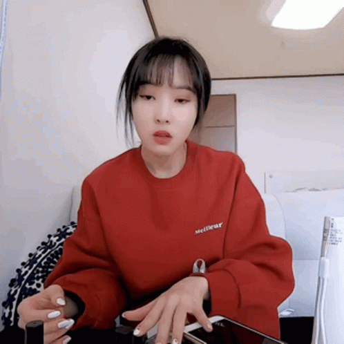Yuju from Yujuzip stretching her arms upwards while wearing a red sweatshirt.