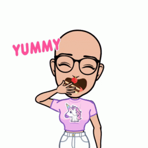A bald cartoon character wearing glasses and a unicorn shirt expresses 'YUMMY' with a hand over their mouth.