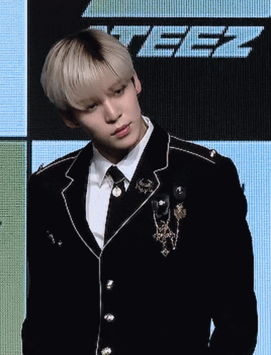 K-pop idol Yunho in a black suit and tie, standing confidently in front of a screen.