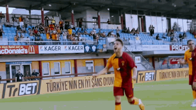 Galatasaray soccer player Yunus Akgün celebrates on the field, wearing his team's distinctive half-and-half jersey.