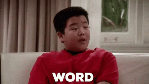 Hudson Yang as Eddie from Fresh Off The Boat, wearing a red shirt, emphatically says 'Word' while sitting on a couch.