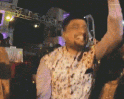 Yus Yash dancing with his arms in the air at a lively night event, smiling and enjoying the moment.