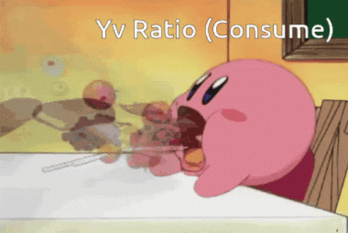 Kirby, the pink cartoon character, sits at a table and rapidly consumes long, brown food items as 'Yv Ratio (Consume)' appears.
