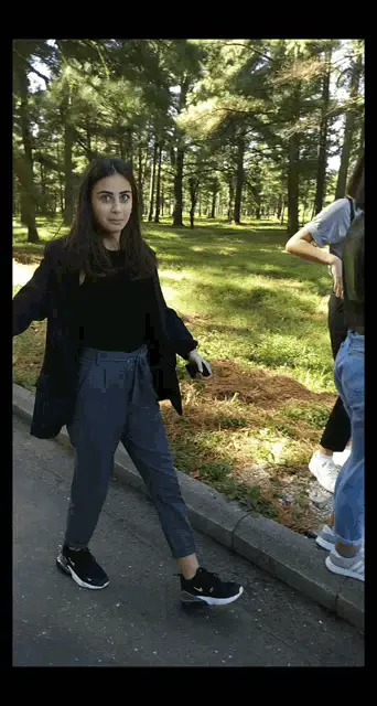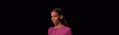 Model with long dark hair walking the runway, showcasing a vibrant pink long-sleeved top and a necklace.