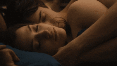 Man and woman embracing peacefully in bed, sleeping or resting together in a tender moment.