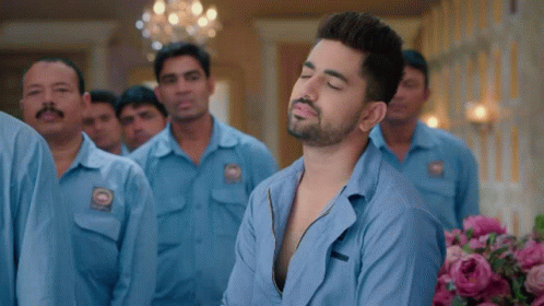 Zain Imam, looking exasperated, raises his hand to signal 'stop' while surrounded by other men in blue uniforms.