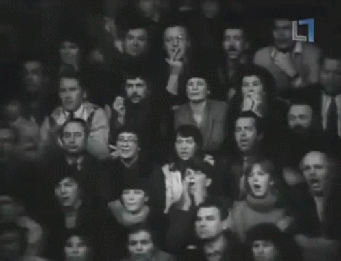 A cheering crowd of Zalgiris fans holding up a sign that reads 'Valio!' in a black and white vintage clip.