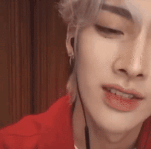 ZB1 member Ricky shows a confused and slightly shocked expression in a close-up, wearing a red shirt.