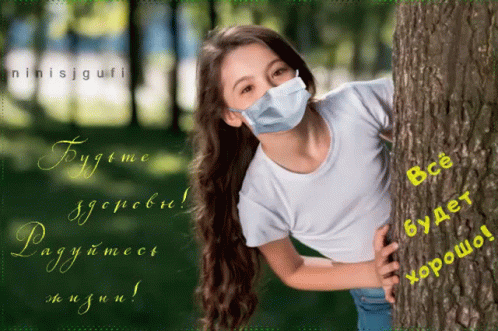 A young girl in a mask peeks from behind a tree, with a message of health and positivity in Russian.