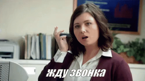 A woman in an office setting gestures while the text 'ЖДУ ЗВОНКА' (Waiting for a Call) appears on screen.