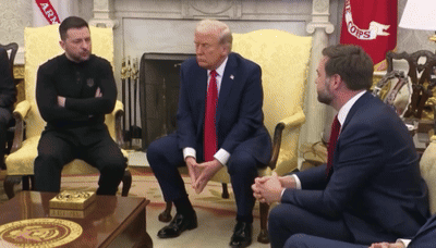 Volodymyr Zelenskyy, Donald Trump, and J.D. Vance in a meeting, with captions about the future.