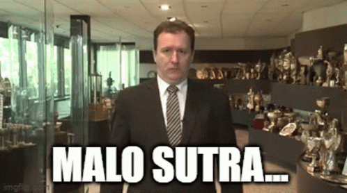 Zeljko Pantic delivers his iconic 'Malo Sutra' phrase in front of a trophy display, associated with Partizan.