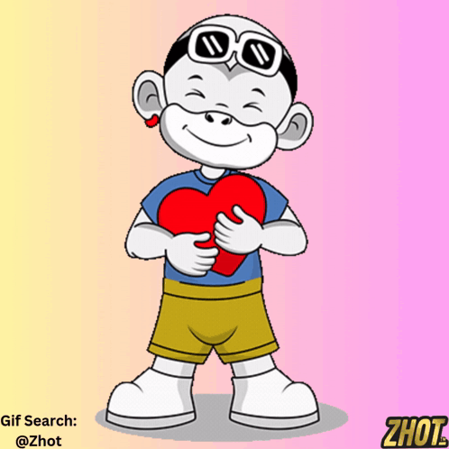Zhot Jr., a cute cartoon character, smiles while holding a red heart as smaller hearts float around him.