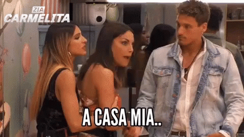 Ziacarmelita and Francescadeandre in a heated moment from Grande Fratello 16, featuring the iconic 'A Casa Mia' phrase.