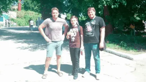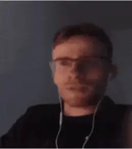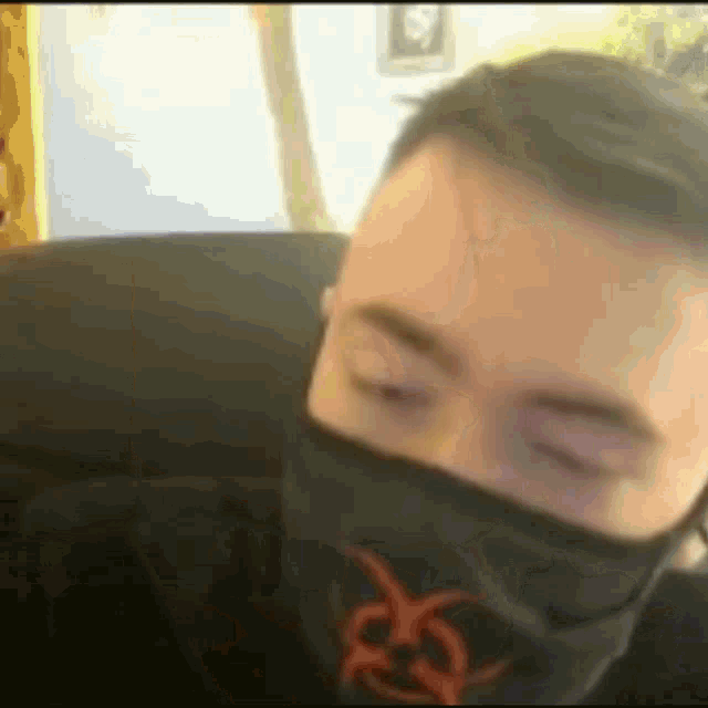 Zio Shevtsov, wearing a mask, holds up a framed photo, then another.