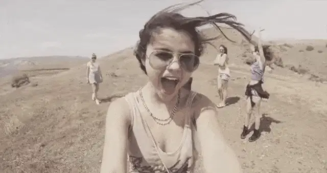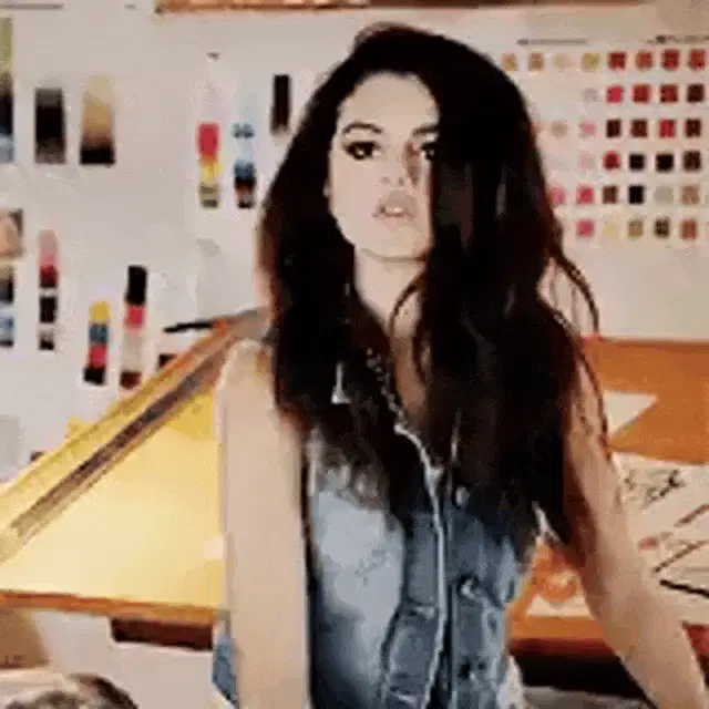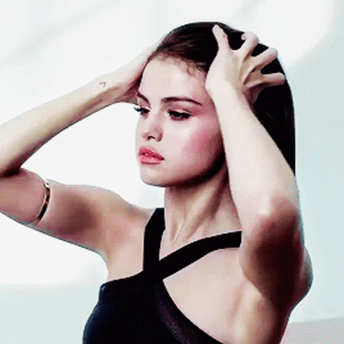Selena Gomez poses gracefully, running her hands through her dark hair while wearing a stylish black top.