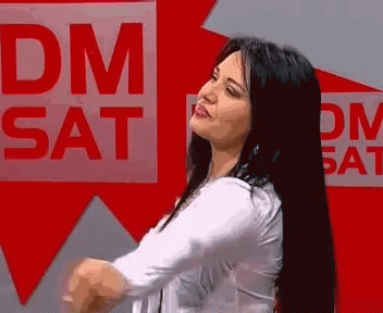 Zlata Petrovic, the turbofolk singer, performs on stage in a white shirt against a DM SAT backdrop.