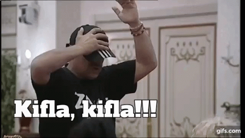 Zmaj Kifla, a man in a black cap, dramatically shouts 'Kifla, kifla!!!' with hands raised.